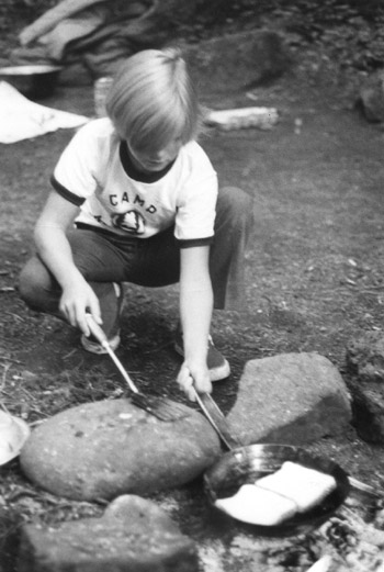 Camper cooking over a fire -1971.